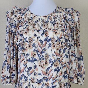 Matilda Jane Good Hart Perennial Florals Ruffled Dress. Size Small. NEW with tag attached. Fully lined. Smocked front bodice. 3/4 sleeve. Ruffles at shoulders. Fully lined. Pullover. Buttons behind neck with keyhole opening. Tiered skirt.