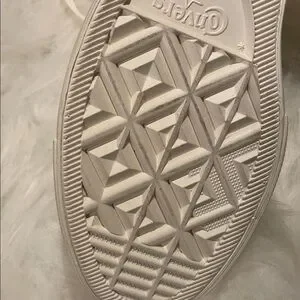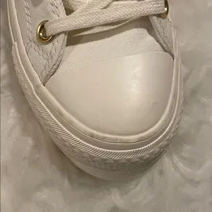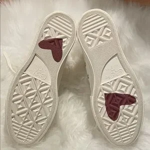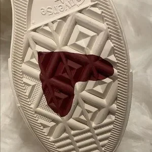Stylish Converse sneakers in cream. Features maroon accents on the sole. Iconic All Star design. Golden Chain. Lift Platform. Worn only once. Please see signs of warring in the pictures. It’s almost like new.