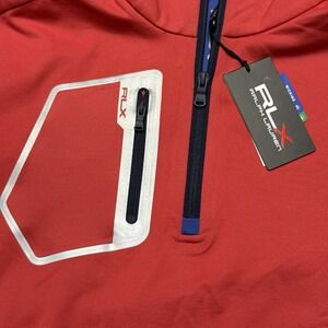 The RLX Ralph Lauren Golf 1/4 Zip Pullover in red is a men's large-sized activewear piece designed for golfing and other outdoor activities. Made of polyester and spandex, this pullover features a mock neck with a 1/4 zip closure, making it easy to put on and take off. It also boasts moisture-wicking and breathable properties, making it ideal for comfortable wear in various seasons. The pullover is machine washable for easy care and maintenance, and it is adorned with the iconic Ralph Lauren logo for a touch of style.