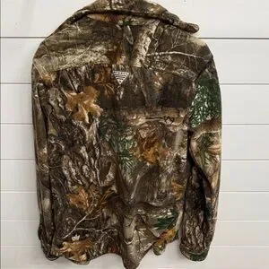 Cozy fleece shirt with a woodland camo pattern. Ideal for outdoor activities.