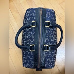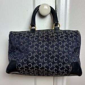 Elegant Celine Boston bag with navy and black pattern. This is a very stylish, eye-catching bag. Features sturdy black handles and subtle gold details. Made in France. Size is comparable to LV Speedy 30. Strap drop is 5”.