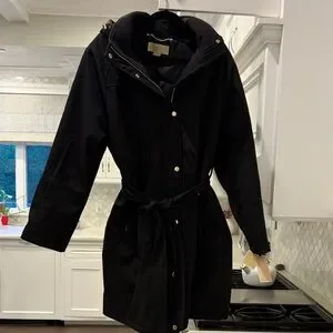 Chic black trench coat by Michael Kors. Features a stylish belt and sleek design. Ideal for versatile wear. Zippered pockets.