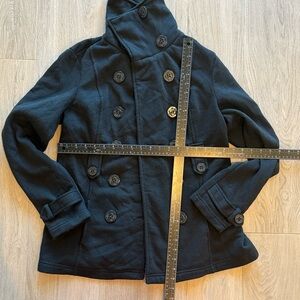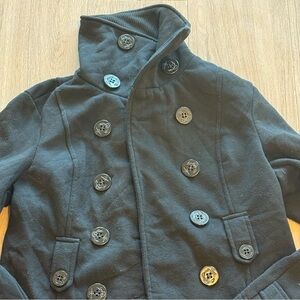 Used black double breasted, short trenchcoat styles, pea coat women’s jacket.