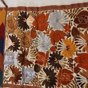 Stunning handmade table runner with intricate embroidery. Pretty flowers in shades of orange, blue, brown, and cream. Very unique piece! Measures 48 in x 17.5 in. Check out my other listings to bundle and save!:)