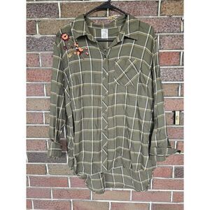NEW Terra & Sky Olive Green Flannel Shirt Embroidery Flower Plaid Plus Sz 0x 14w