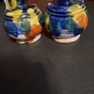 Vintage MEXICAN Signed MINI DRIP GLAZE POTTERY PITCHER WITH SAWTOOTH RIM lot of 2 One has damage on the bottom edge. The other one has a rough spot on lower side see pictures (6248)