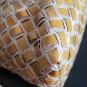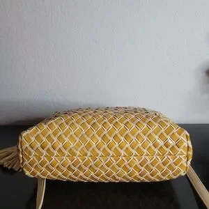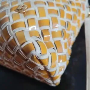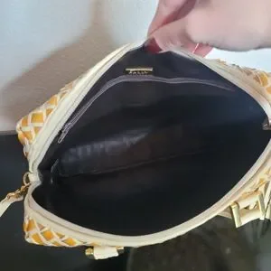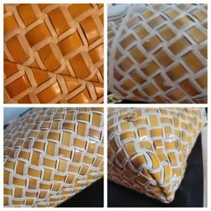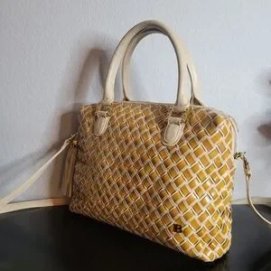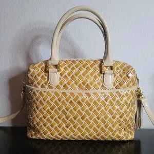 Stunning bag with elevated craftsmanship with a combination of Lambskin Leather with woven patent leather in a gorgeous colorblock design.
