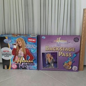 Hannah Montana Backstage Pass hardback book with poster, stickers, door hanger, and charm as well as Hannah Montana Encore Edition DVD game. The book is 10.5 inches by 12 inches.