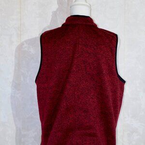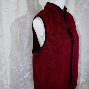 This classic St. John's Bay fleece vest is a versatile layering essential for outdoor activities, casual wear, or the office. Made from soft, warm polyester fleece in a vibrant red hue with black trim, it provides lightweight insulation without the bulk of a jacket. The vest features a full-zip front, a mock neck collar, and two convenient side zip pockets. This item is in excellent used condition (EUC) with no known flaws.