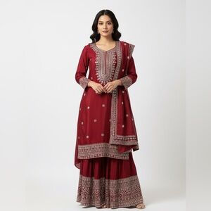 Beautiful burgundy Sahara salwar with detailed embroidery. Ideal for elegant events.
