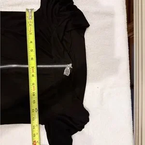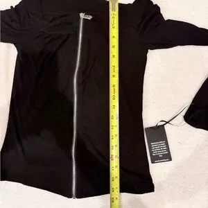 Chic black button-down shirt with a front zipper. Long sleeves and elegant design. Perfect for versatile styling.