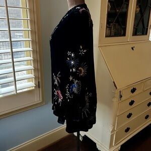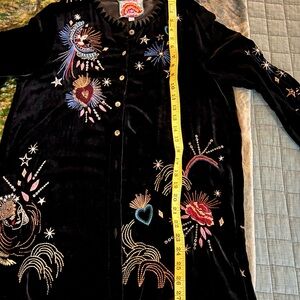 Elegant Johnny Was Victoria Voyager velvet tunic with gorgeous embroidery. Features button-up front and celestial embroidered designs. EUC, size XS, a bit oversized, no flaws.