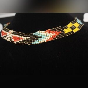 Vibrant beaded choker with intricate patterns. Features black, red, yellow, and blue beads.