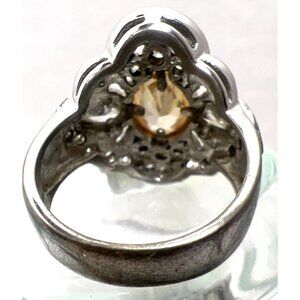 A bold, intricately designed sterling silver ring showcasing a Champaign oval gemstone and clear tear-shaped Bezel Set stones surrounded by multiple prong set stones.. Adds elegance to any look.