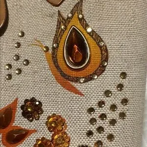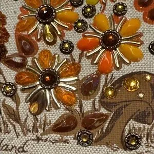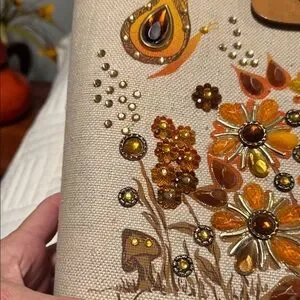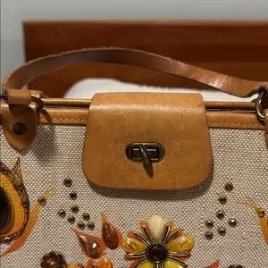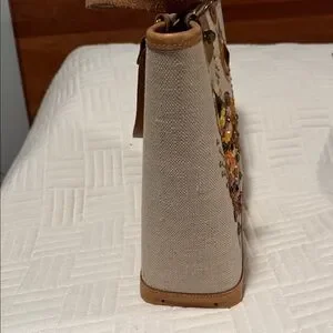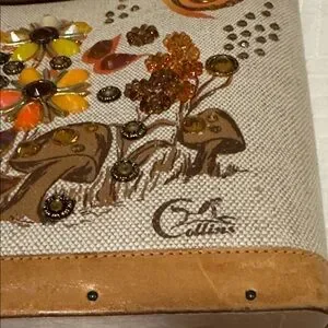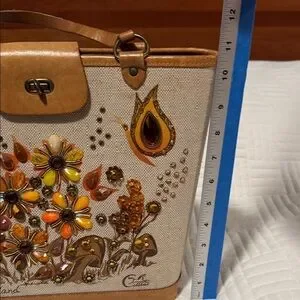 Enid Collins Wonderland tote Fan of Alice in wonderland this has fun flower and mushrooms motif. One center jewel missing from a flower. Review photos. Otherwise super condition and a light brown color to leather I haven’t seen before. Ask questions Thank You.