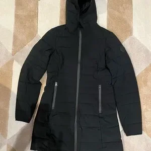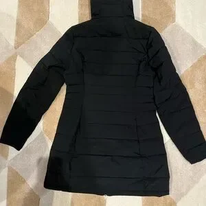 Elegant black puffer coat with hood. Features front zipper and side pockets.