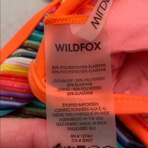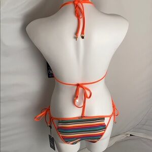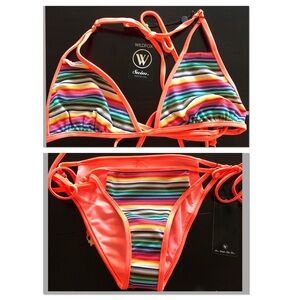Wildfox Zooey sexy boho rainbow triangle cut-out bikini top and matching string bottom. Halter strap ties at neck and back. Bottoms have tie sides with charms on end. Both top and bottom have cut outs. Rainbow stripe pattern. 80% poly 20% elastane. Sold out. Separately the top was $92 and the bottoms were $102. They were sold as separates from Wildfox. NWT - never tried on. Smoke free home