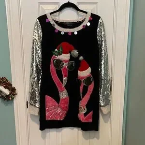 Celebrate the holidays in style with this festive flamingo sweater. Featuring vibrant pink flamingos and shimmering silver sleeves, it's perfect for adding a touch of fun to your wardrobe.