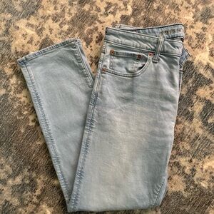 Comfortable light blue denim with AirFlex+ technology. Features button closure and belt loops.
