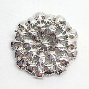Unmarked vintage brooch with emerald-green and clear rhinestones arranged in a round floral starburst pattern. Features pear, square, and round faceted stones set in bright silver tone metal. Measures about 2 inches wide.