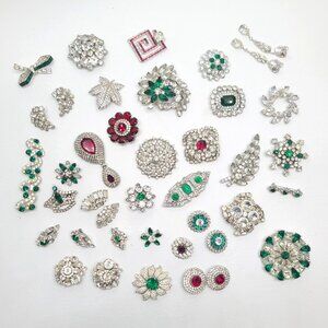 This piece comes from a vintage costume jewelry collection sourced from a lifelong New York collector who acquired pieces over several decades. We curated the Christmas-themed lot by selecting clear, red, blue, and green pieces suitable for holiday styling.