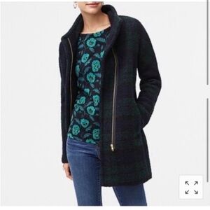 New with tags green plaid/ checkered J. Crew coat. About 18 inches under arm to end of sleeve, about 18.5 inches underarm to underarm and about 30 inches long. J. Crew green plaid checkered coat.