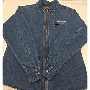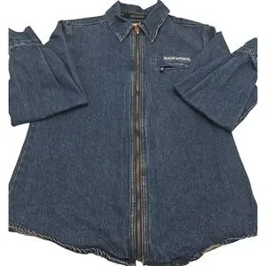 The product is a vintage original Harley Davidson women's jacket in size large, made of denim in a classic blue color. It features a motorcycle style design, perfect for biker or casual wear. With the iconic Harley-Davidson brand, this jacket offers a stylish and durable option for women looking to add a touch of biker flair to their wardrobe. Perfect for riding or simply looking to make a statement, this Y2K era jacket is a unique and timeless piece.