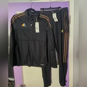 Black Adidas tracksuit featuring vibrant multicolor stripes. Includes jacket and pants. Perfect for style and comfort.