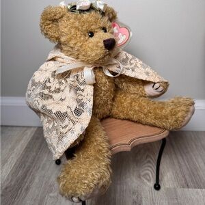 Style: Vintage teddy bear with lace dress and floral bonnet