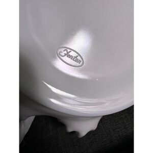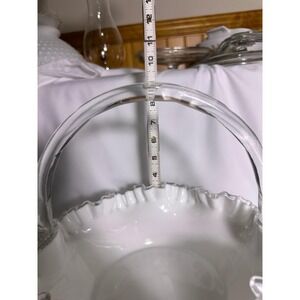 This vintage Fenton milk glass basket features the beloved Silver Crest design with its distinctive ruffled edge trimmed in clear glass. Crafted with elegant hand-blown artistry, the basket showcases a striking clear glass handle fused to the fluted rim with a textured, quilted-look join. The glossy white milk glass body flares out to a wide, dramatic shape, giving the piece a graceful yet bold presence. The base is stamped with the Fenton logo, confirming its authenticity. Perfect as a centerpiece, wedding display, or for collectors of fine American art glass.