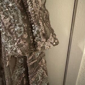 Stunning Mac Duggal gown with intricate sequin design. Long sleeves add elegance. Ideal for special events.