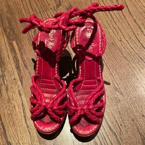 Vintage red leather heeled sandals. Good condition with minimal wear. The base/ heels are solid wood and I believe the braided straps are leather, however I do not see any material information. Made in Spain.