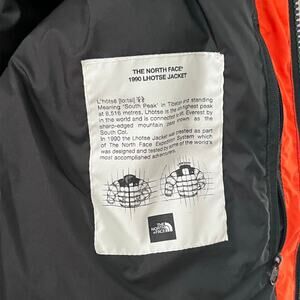 The North Face 1990 Lhotse Jacket in men’s size small, featuring a bold orange and black colorblock design with 700 fill down insulation. Iconic retro expedition style inspired by the original 1990 Lhotse mountaineering jacket. Features full zip front, adjustable cuffs, insulated high collar, zip hand pockets, and embroidered logos. Warm, durable, and ideal for winter, outdoor wear, and streetwear style. Excellent for collectors of TNF heritage pieces. Approximate measurements: pit to pit 21 inches, length 27.5 inches.