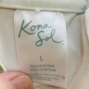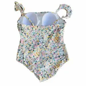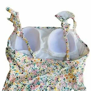 Kona Sol Ladies One Piece Swimsuit in US Size L - a charming multicolor floral print swim suit with cute ruffles on the adjustable straps. Nylon spandex blend fabric is soft with structure and plenty of stretch. Lightly padded built in bra - modest full coverage leg. With its trendy design and eye-catching colors this swim suit is sure to turn heads every time you wear it - perfect for a dip in the ocean or lounging by the pool. Gently worn - no flaws.