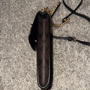 Elegant Coach shoulder bag in black and brown. Accented with a gold chain strap.