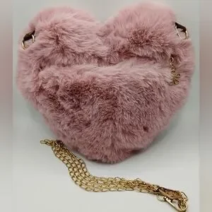 This charming pink heart-shaped crossbody bag is crafted from soft faux fur, perfect for adding a touch of whimsy to any outfit. The gold chain strap adds a hint of elegance, making it a versatile accessory for day or night. BNWOT (9"H×9.5"L).