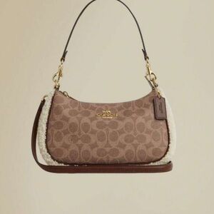 Chic Coach shoulder bag with signature pattern. Features tan and cream tones. Ideal for versatile styling.