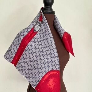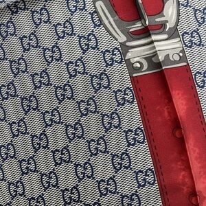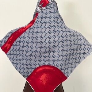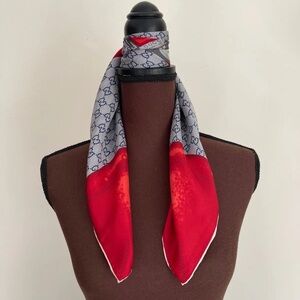 Elegant Gucci scarf with signature pattern. Features striking red accents. Perfect for adding a touch of luxury.