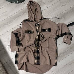 Stay cozy and stylish with this tan hooded jacket. Perfect for layering, this jacket offers a chic look with its comfortable fit and versatile design.