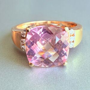 A finely crafted Circa 1980's ring originating from the Estate of a prominent socialite. This 14K fine solid gold ring showcases a central cushion cut, faceted Pink Topaz weighing approximately 4.6 carats. It boasts eye clean clarity and a stunning light to medium pink hue. The ring exhibits excellent symmetry and craftsmanship, adhering to a high standard of faceting precision. Additionally, it features diamonds set vertically on either side. The six radiant round brilliant cut diamonds have a total combined weight of 0.13 carats. The band is a classic thick design that graduates in thickness.