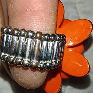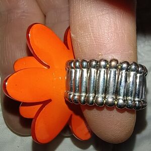 2 Vtg Silver-Tone Rings: *Orange Resin Dahlia & *Red Enamel Poppy Bouquet