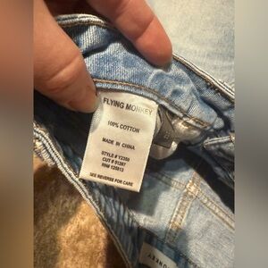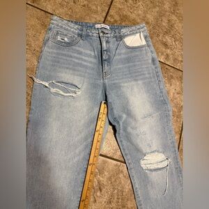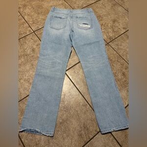 Trendy light blue jeans with distressed details. Straight leg design for a classic look. Perfect for casual outings. (Box Q)