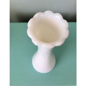 Vintage, white milk glass, flower vase, with hobnail detail on top rim, that has a scalloped edge, and has the 'ring of fire' (in pics) from the 1960's. This is not a brand new item, it is from years past, even though it is in excellent condition, it is not new. Measures 8.5" tall. There aren't any maker's marks on this item.
