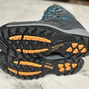 Teal and gray boots by Columbia. Perfect for outdoor activities. Comfortable and durable design.