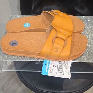 Step into comfort with these stylish tan slide sandals. Perfect for casual outings.