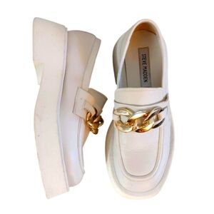 Stylish white platform loafers. Features a bold gold chain accent. Perfect for elevating any outfit.