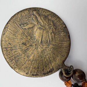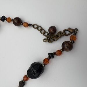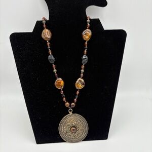 Beautiful boho-style beaded necklace featuring marbled brown beads, black accent beads, amber crystals, and antique brass hardware. Finished with a large round embossed medallion pendant. Adjustable clasp. Great condition with natural patina on the Features: