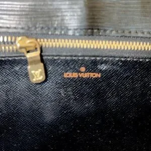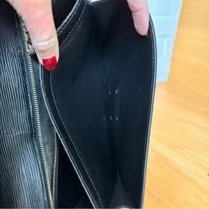 Exterior epi leather, including edges and corners, is in very good condition. Interior 2 compartments are in very good condition (photos). Sticky residue of interior zippered pocket has been removed leaving a felt like lining (photo). Zipper in the interior pocket opens/closes smoothly. Gold clasp functions properly, and is in good condition (photo). Hardware has some light tarnish (photo).