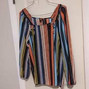 Chic blouse with vibrant stripes. Features a stylish off-shoulder design. Perfect for casual outings.
