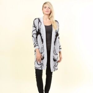 Cozy chic long-line cardigan. Art meets fashion with a mystery woman smokey pattern on the back. Features ribbed trim and side pockets. Content: 30% polyester/30% acrylic/40% nylon